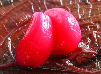 福部産ラッキョウを香り高いシソの葉で一粒一粒丁寧に包み、自社製造の甘酢液に漬け込んで、上品な風味に仕上げた。鳥取県から「ふるさと認証食品」として認定を受けている。