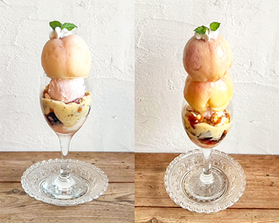 桃を丸ごと乗せた写真映え抜群の贅沢スイーツ「ときめき」と「どきどき」。香り高い紅茶ジュレと合わせ、爽やかな甘さと上品な香りを、この季節だけの特別な味わいで楽しめる。
