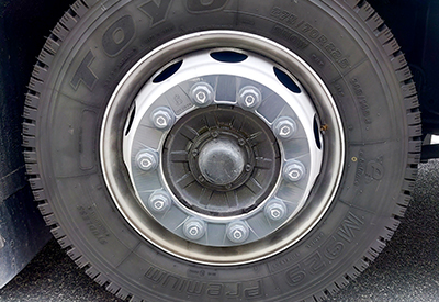 大型車両の車輪脱落事故の防止を目的に開発した脱落防止用器具。ナットのゆるみが一目で確認できる。キャップと円盤が一体化して取り付けやすく、見た目にも違和感がない。写真は流通(倉吉市)提供。