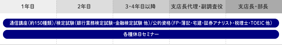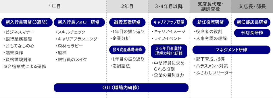 また、支店長代理や次長、支店長への昇進に伴い、「支店をマネジメントする」といったものに重点を置いたマネジメント研修等も行っています。