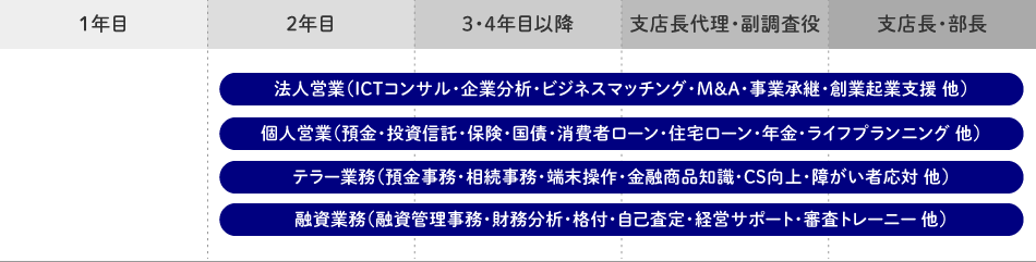 その後、営業店へ配属となりますが、各職場でもOJT(On the Job Training:職場内研修)により計画的に様々な銀行業務を経験し、早期の業務習得を目指します。