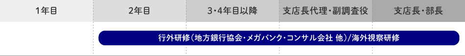 地方銀行協会やメガバンク、コンサル会社等に派遣され、専門的な知識やスキルを身に付けます。 期間は地方銀行協会への派遣で1~2週間程度、メガバンクで6ヶ月~1年程度です。 また、銀行員としてのグローバルな視野及び見識の向上を図るべく、海外視察研修も実施しています。これまでに上海、タイ、ベトナム、シンガポール、マレーシア等の東南アジアを中心に訪問しています。