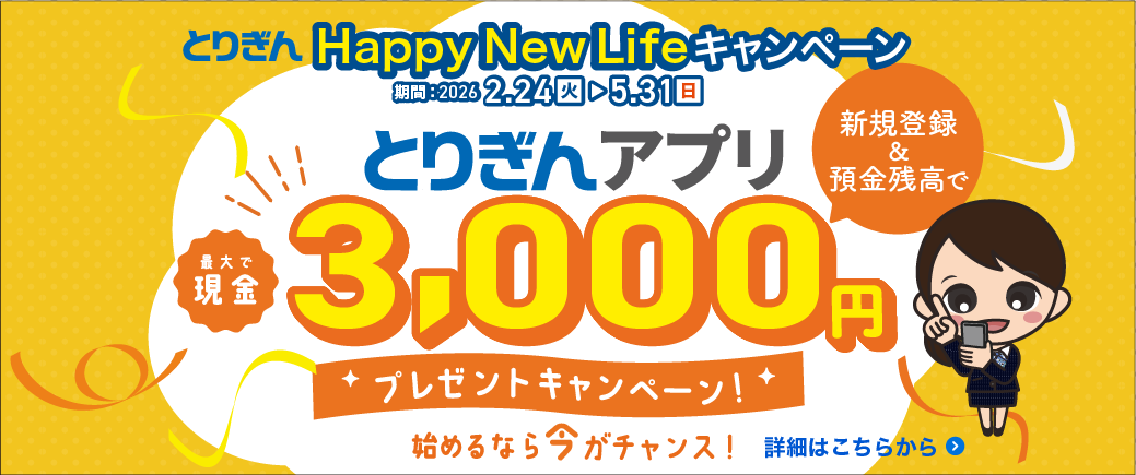 | ご利用いただける方 | 鳥取銀行でキャッシュカード(クレジット一体型キャッシュカード含む)が発行された普通預金口座(決済用普通預金・総合口座普通預金含む)をお持ちの個人のお客さま(日本国内に居住のお客さまに限る) |