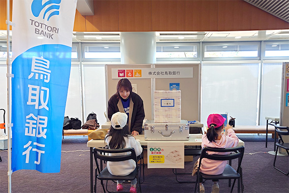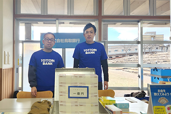 当行では、鳥取県主催のイベントなどで、模擬紙幣を数えたり、お金の重さを体験するお金に関するワークショップを開催しています。