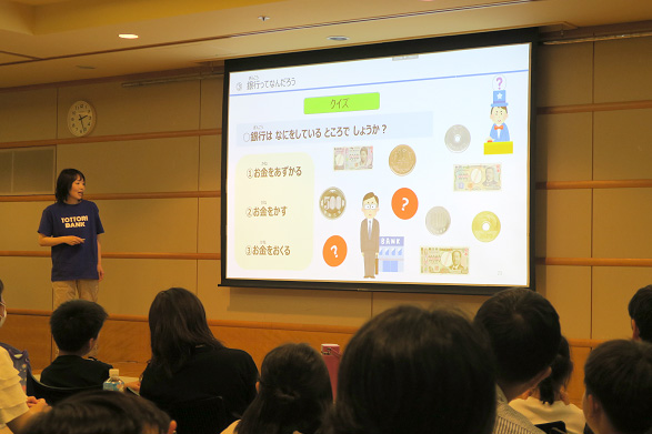 鳥取銀行の時間は、模擬紙幣を数えたり、お金の重さを体感しました。また、お金に関することや銀行の仕事などについてクイズを出題し、理解を深めました。また、大山日ノ丸証券様の時間は、「株式のしくみ」の説明や株主体験をしていただきました。